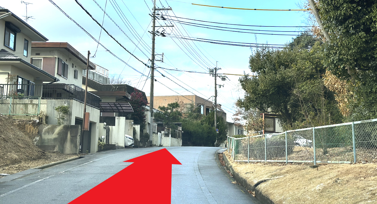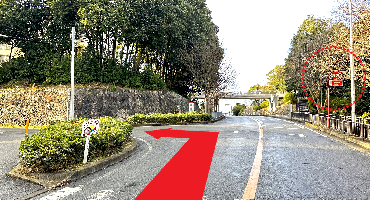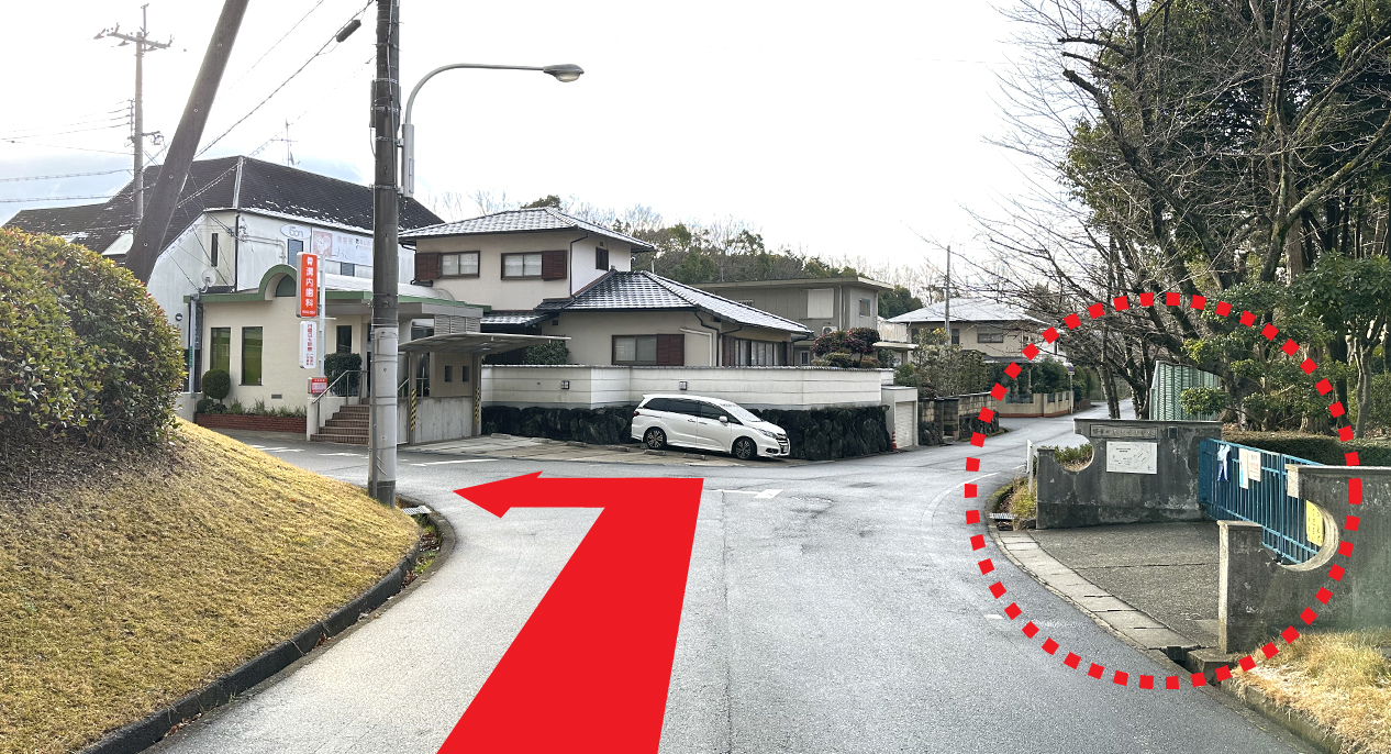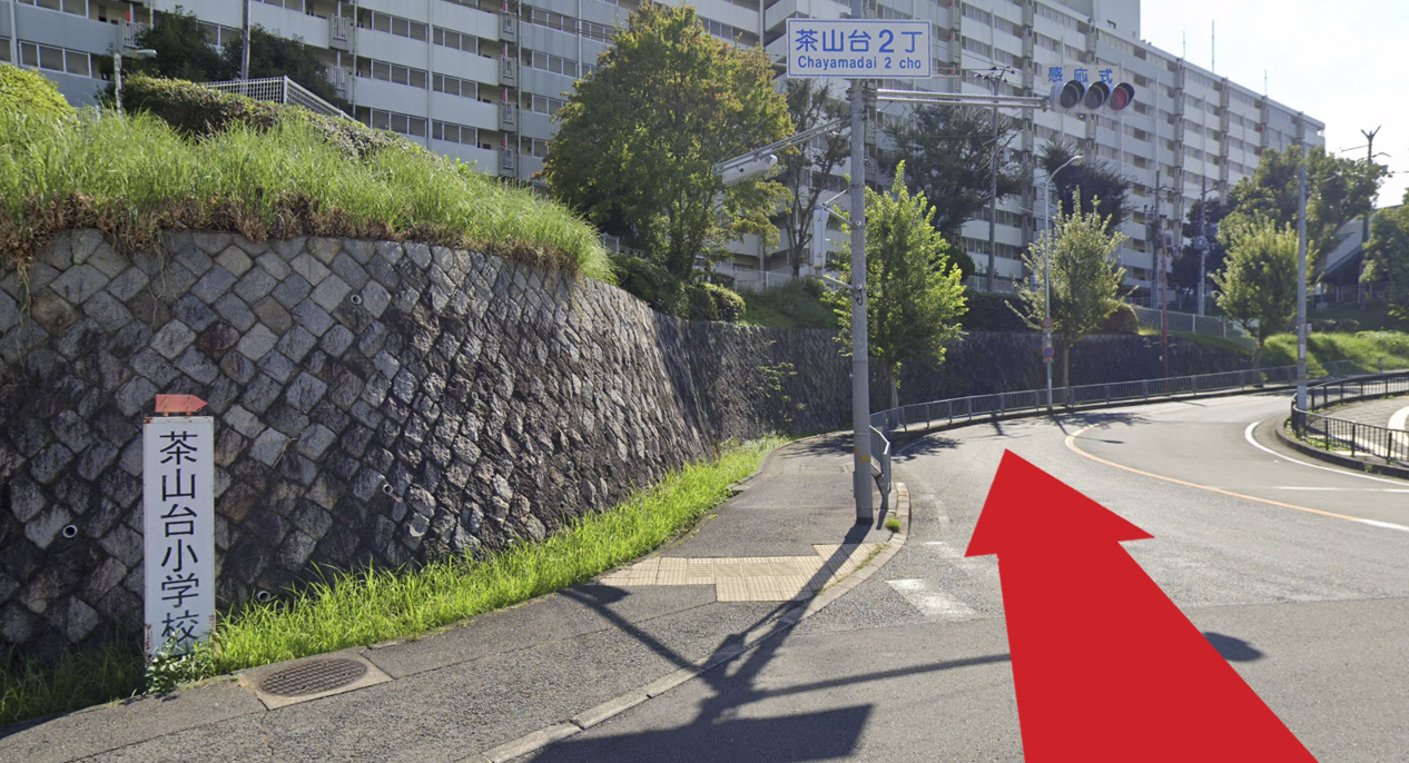 道なりに進むと右側に茶山台小学校の正門がありますので、そこを左に曲がります。