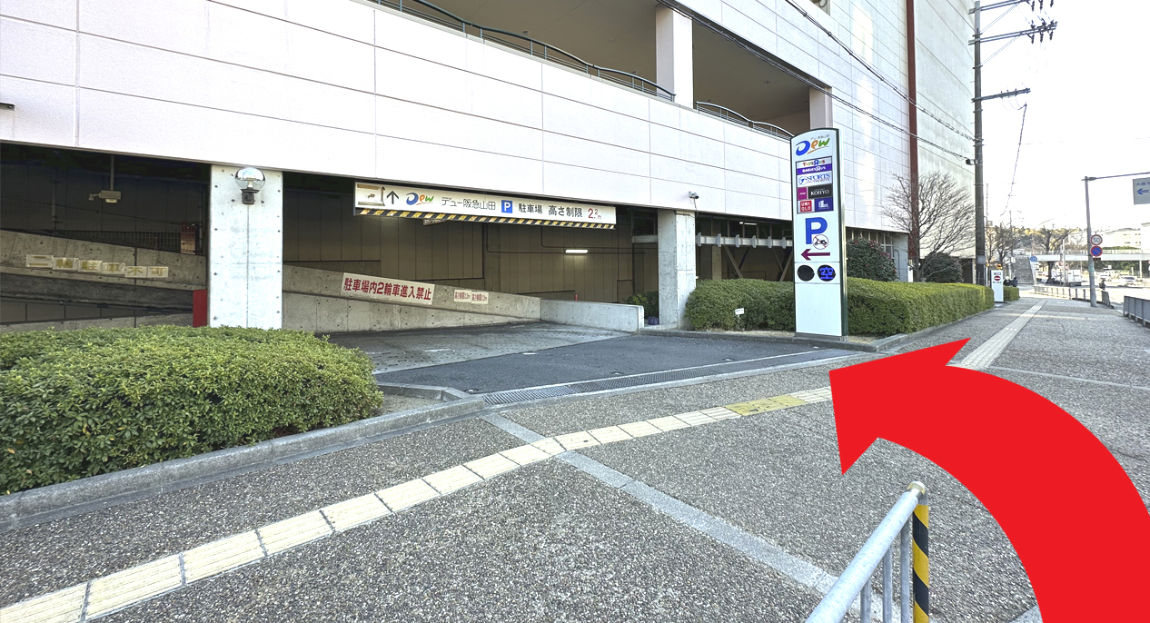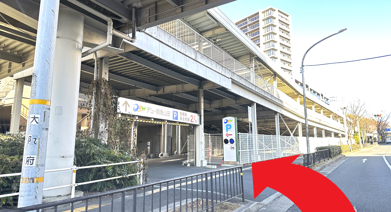 大阪府道129号を左に曲がりDew阪急山田駐車場へ。(梅田方面行からお越しの場合の入口)