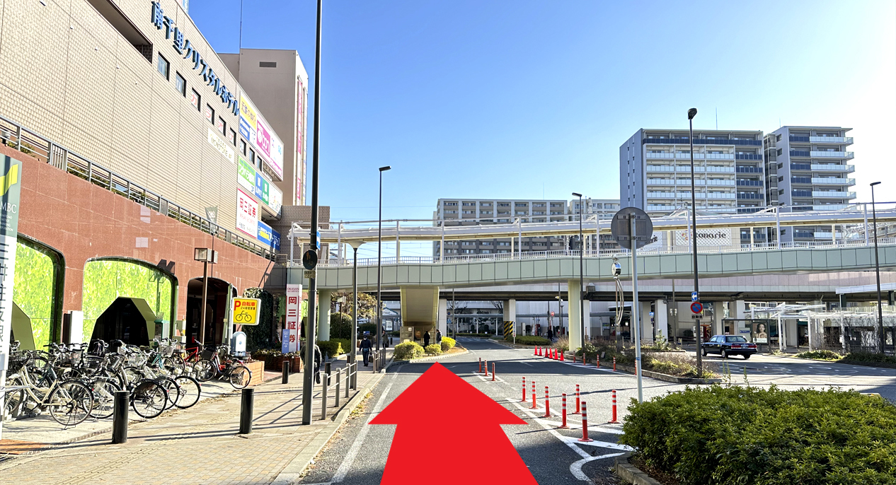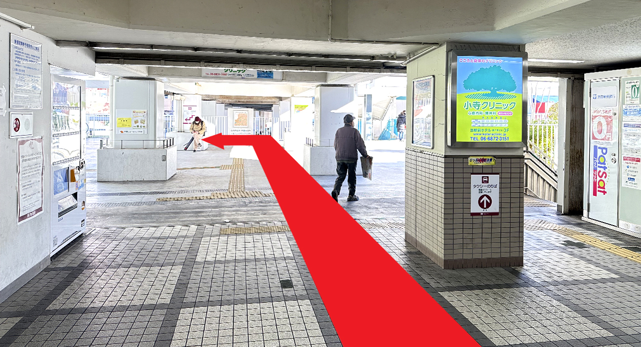 南千里駅の改札口を出て、左方向に進んでください。