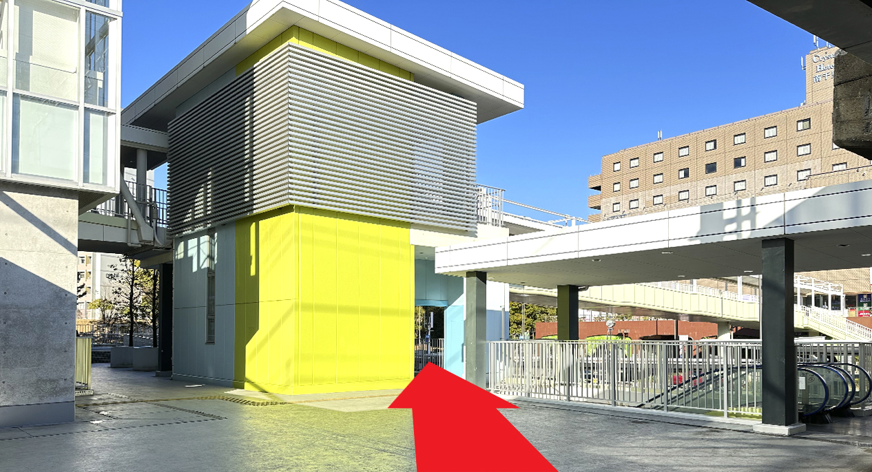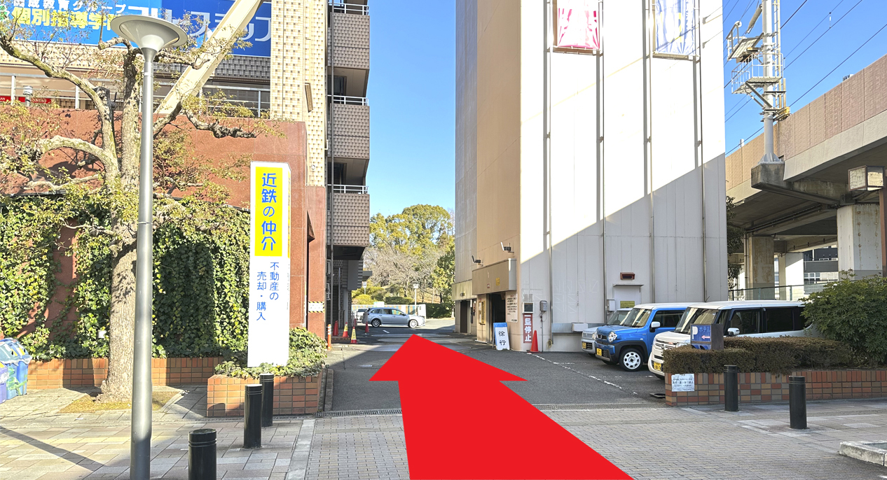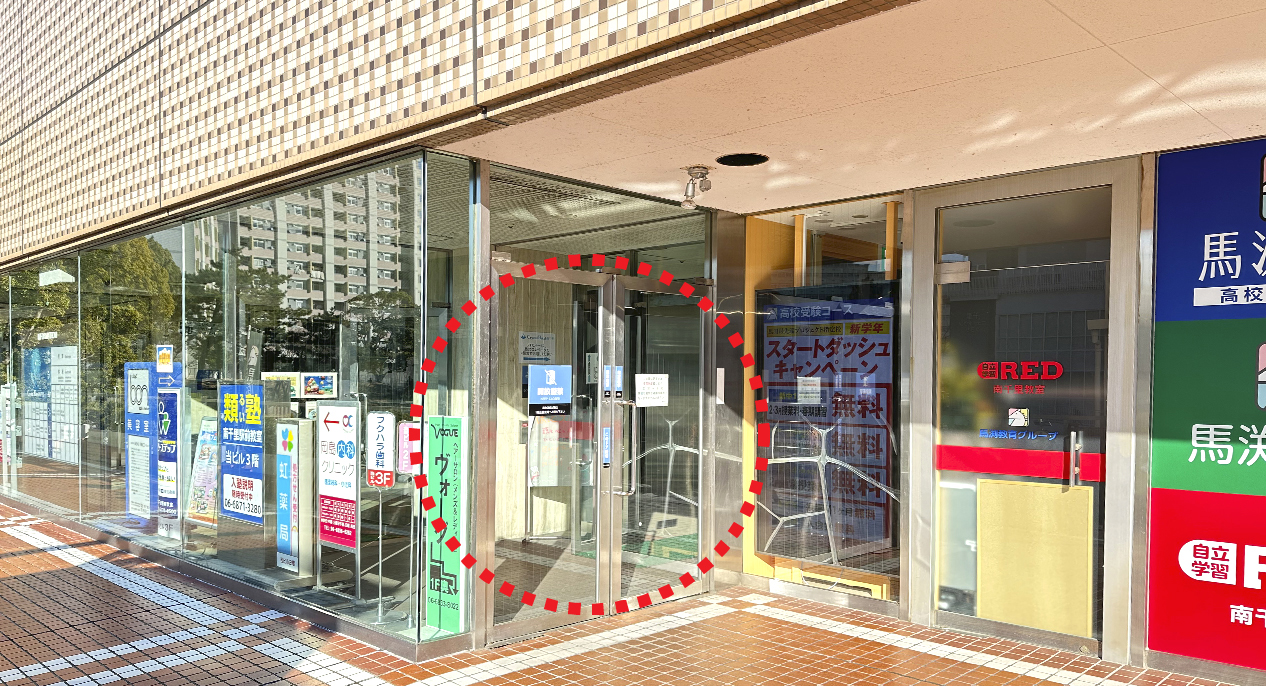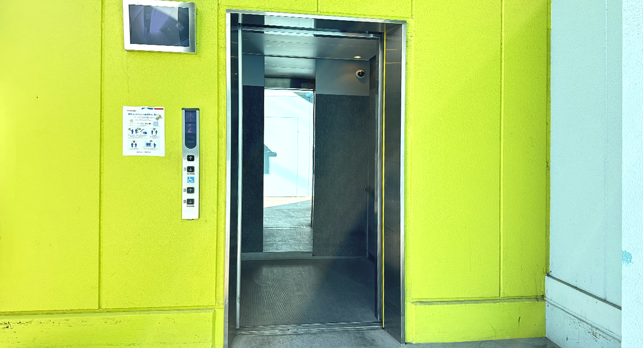黄緑色の建屋正面のエレベーターに乗り3階へお進みください。