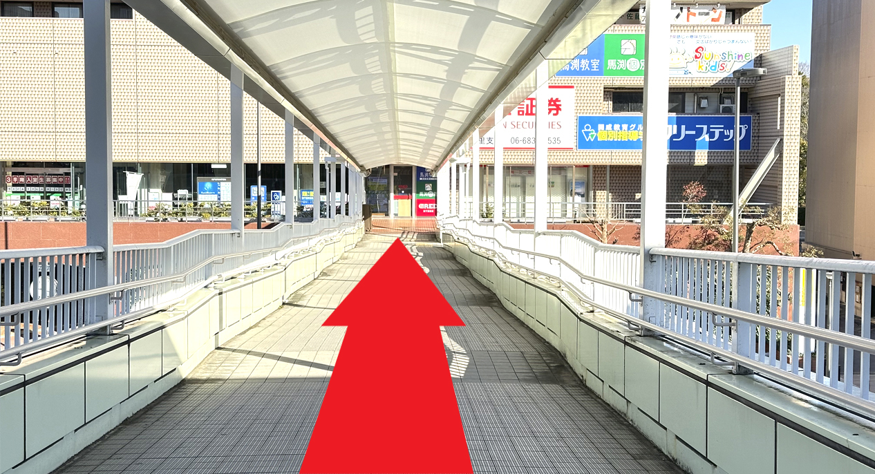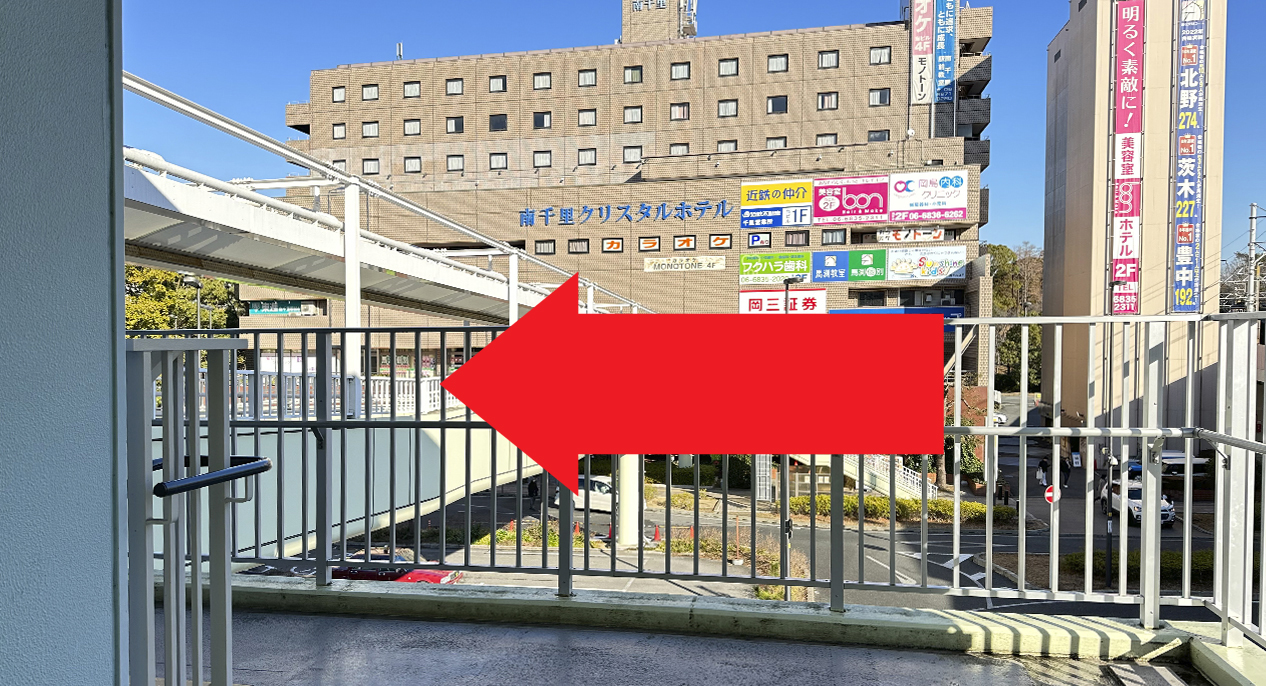 歩道橋を進んで南千里クリスタルホテル2階入口へお進みください。