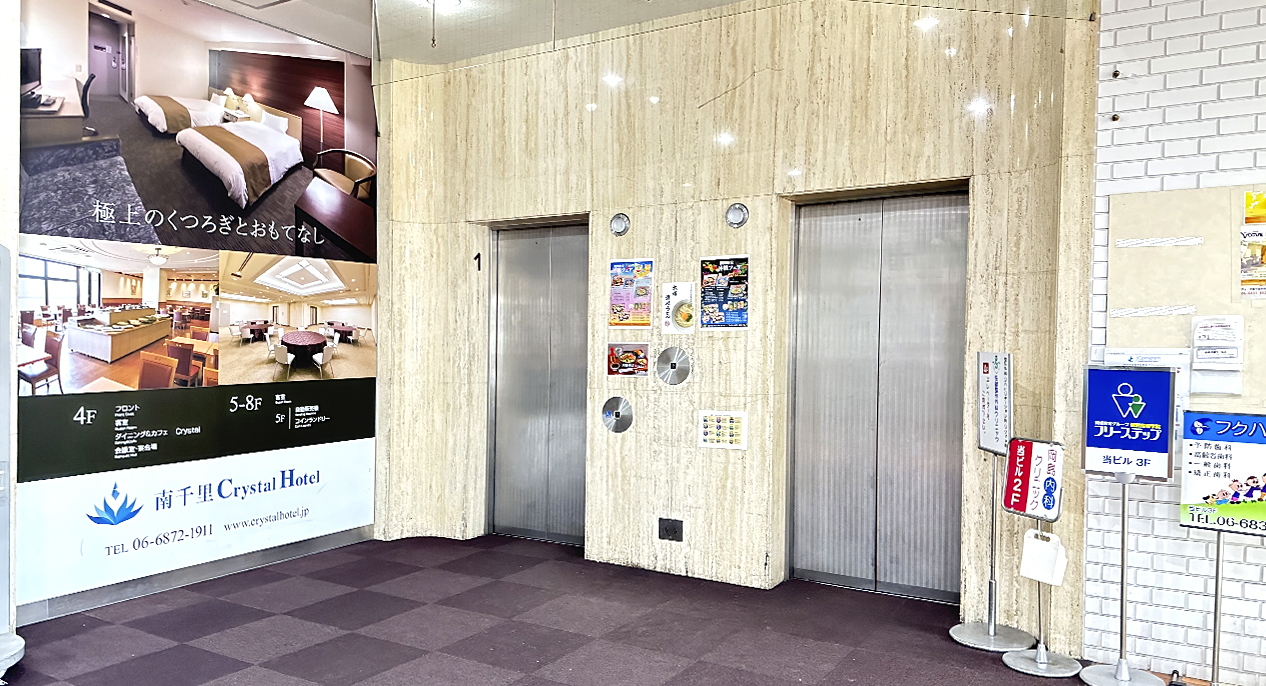 南千里クリスタルホテル内のエレベーターで2階へお進みください。