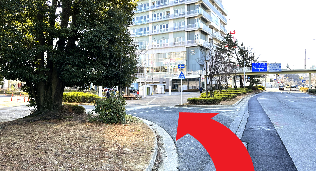 大阪府道121号を左に曲がり、南千里クリスタルホテル前のロータリーへお進みください。