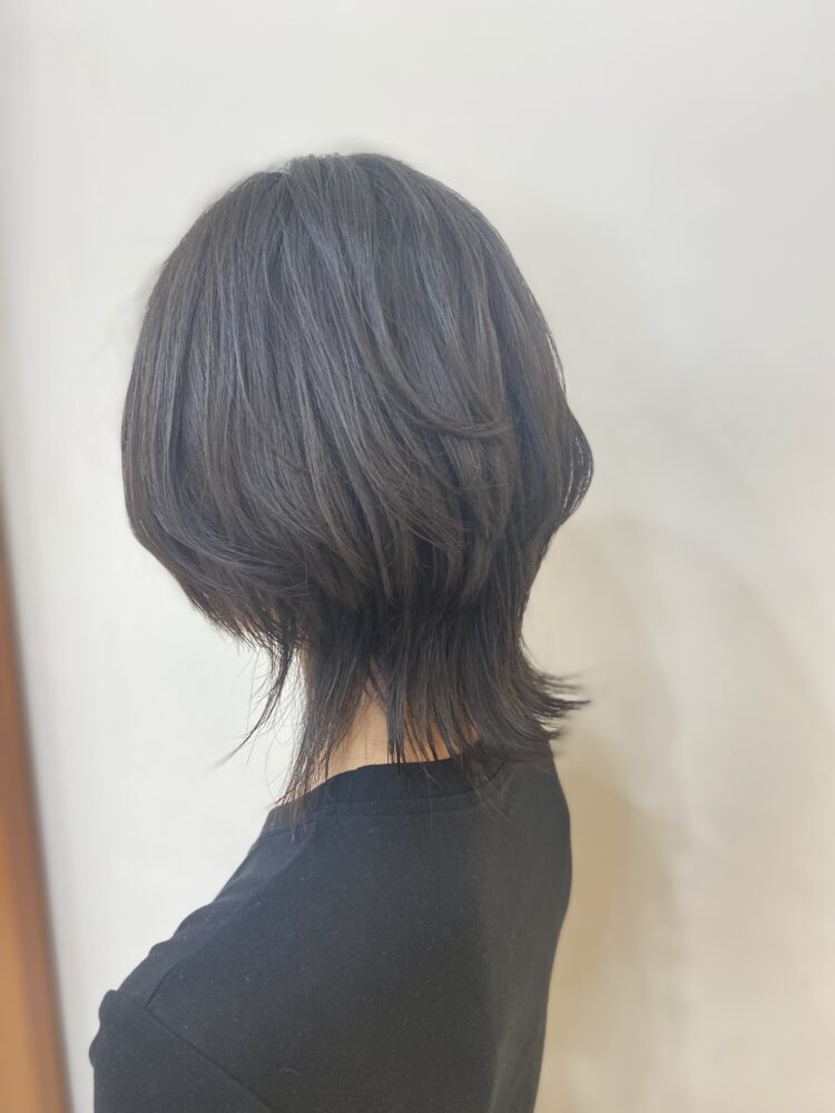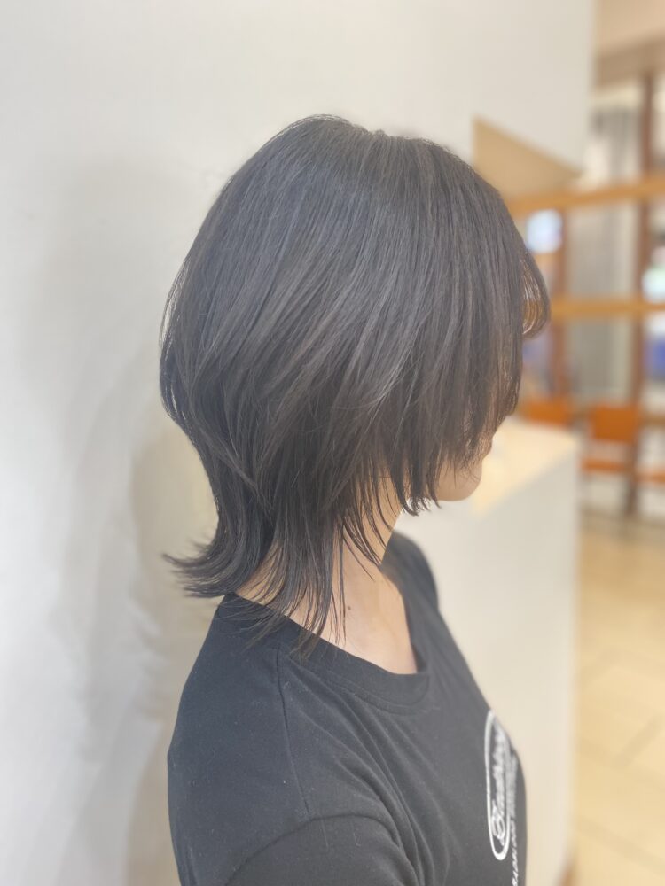 通常のウルフカットよりもボリュームを抑えたナチュラルなシルエットが特徴。