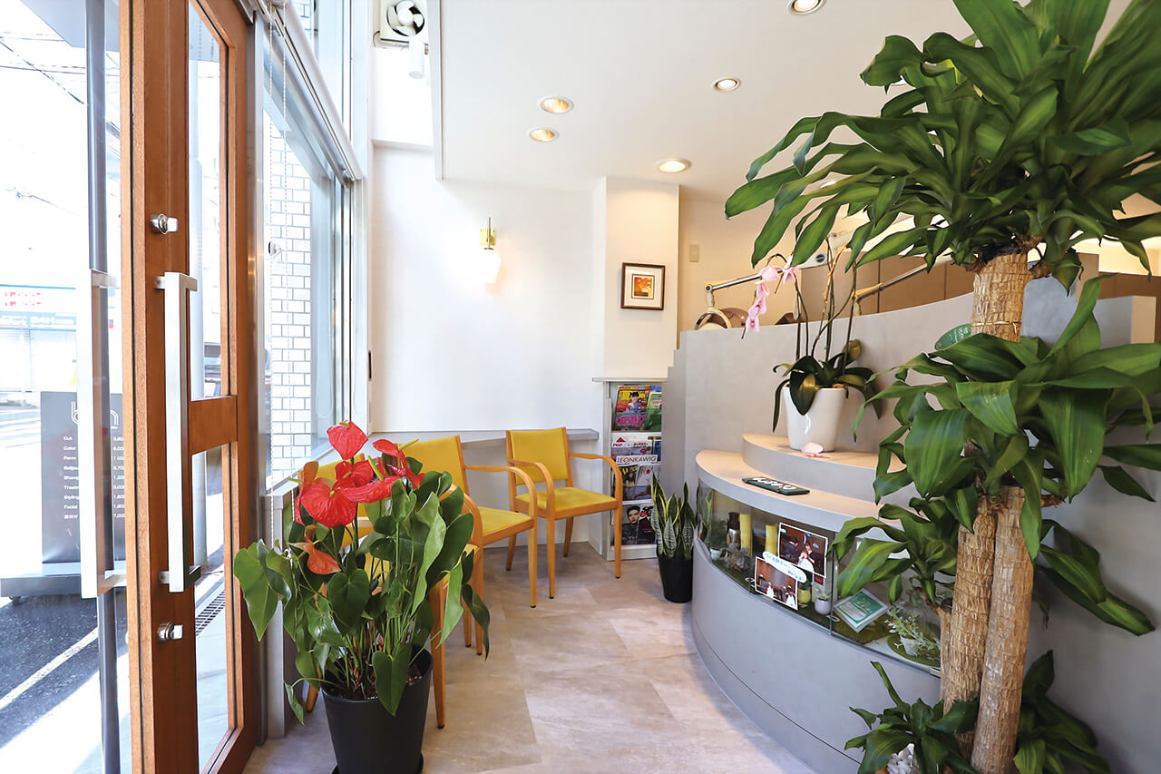 店内には植物が多く、毎週新しいお花を届けてもらい、全てお店のスタッフが生けていて、お客様からもいつもすごく好評です。